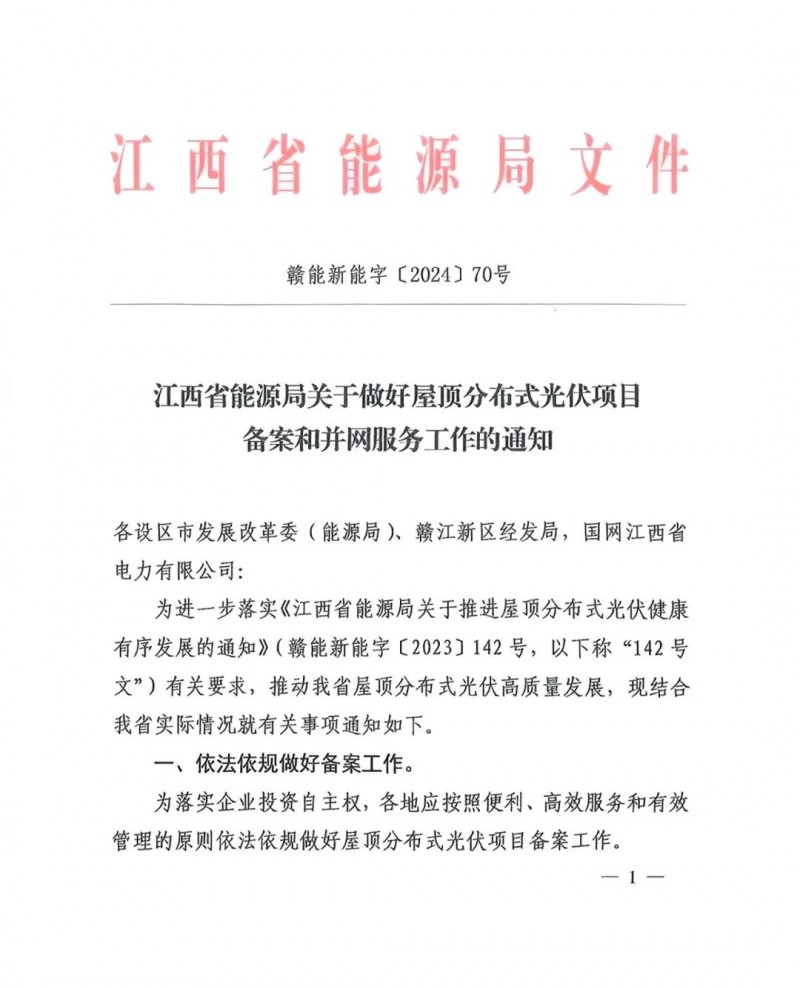 2024年7月3日,江西省能源局下發《關于做好屋頂分布式光伏項目備案和并網服務工作的通知》,該文件為2023年12月20日,江西省能源局發布的《關于進一步推進屋頂分布式光伏健康有序發展的通知》(贛能新能字〔2023〕142號,以下稱“142號文”)的進一步補充說明文件,針對目前分布式市場存在的停止備案、并網周期長等問題做進一步說明!