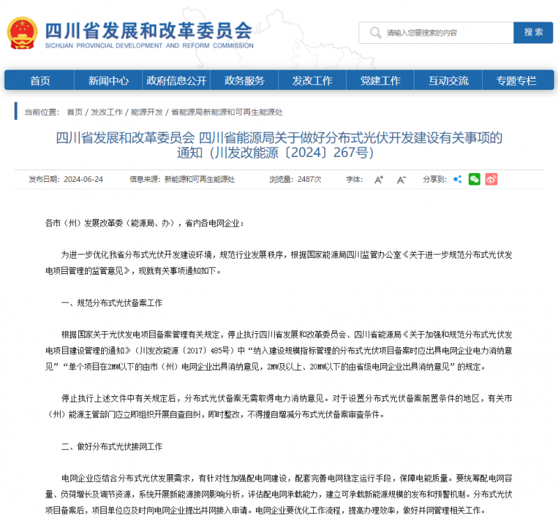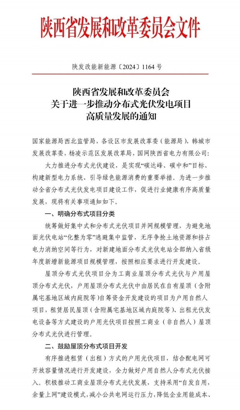 2024年7月16日,陜西省發改委發布《關于進一步推動分布式光伏發電項目高質量發展的通知》,通知明確:統籌做好集中式和分布式光伏項目并網規模管理,為避免地面光伏電站“化整為零”逃避集中監管,無序爭搶土地資源和擠占電力消納空間等行為,對新建地面分布式光伏電站全部納入省級年度新增新能源項目規模管理,按照相應要求進行開發建設。