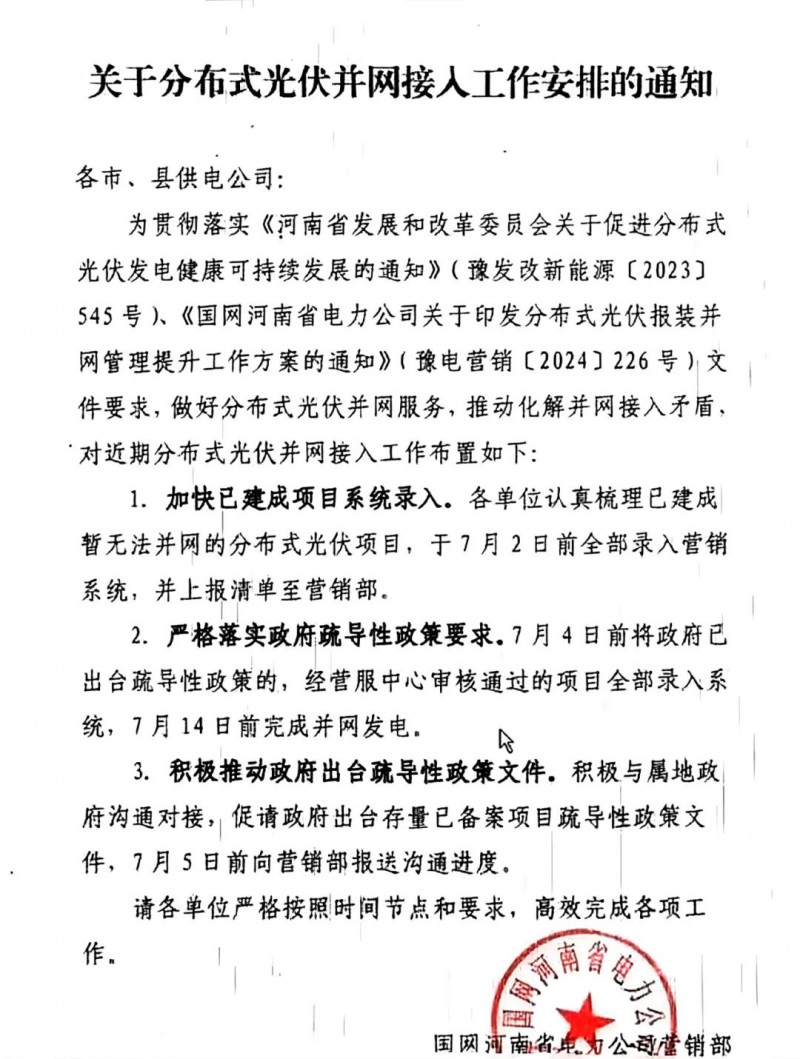 近日,河南省電網發布了《關于分布式光伏并網接入工作安排的通知》,通知提出:各單位認真梳理已建成暫無法并網的分布式光伏項目,于7月2日前全部錄入營銷系統,并上報清單至營銷部。7月4日前將政府已出臺疏導性政策的,經營服中心審核通過的項目全部錄入系統,7月14日前完成并網發電。