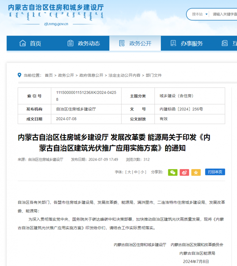 內蒙古自治區住房城鄉建設廳、發展改革委、能源局聯合印發《內蒙古自治區建筑光伏推廣應用實施方案》。