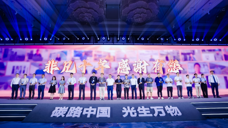 大會設置了“十年風雨同舟”特別策劃環節,邀請了多位陪伴華為多年的客戶,現場頒發了頂部鑲嵌“非凡十年 感謝有您”的紀念章,該紀念章取材于十年前的逆變器部件,用時光鐫刻華為與客戶共同走過的路。