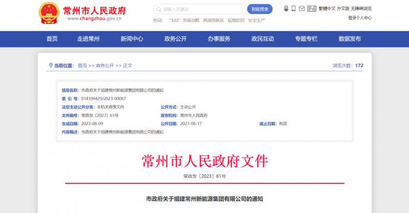 2023年8月,江蘇常州市人民政府發(fā)布通知,擬組建“常州新能源集團(tuán)有限公司”,注冊資本10億元人民幣,出資主體為常州市人民政府,與常州市城市建設(shè)(集團(tuán))有限公司統(tǒng)一運(yùn)營,實行“兩塊牌子、一套班子”運(yùn)作管理模式。常州市新能源集團(tuán)有限公司將按重點圍繞分布式光伏、充換電設(shè)施、氫能、新型儲能、虛擬電廠和綜合能源服務(wù)等六大應(yīng)用領(lǐng)域開展布局,為推動常州建設(shè)新能源之都提供支持。