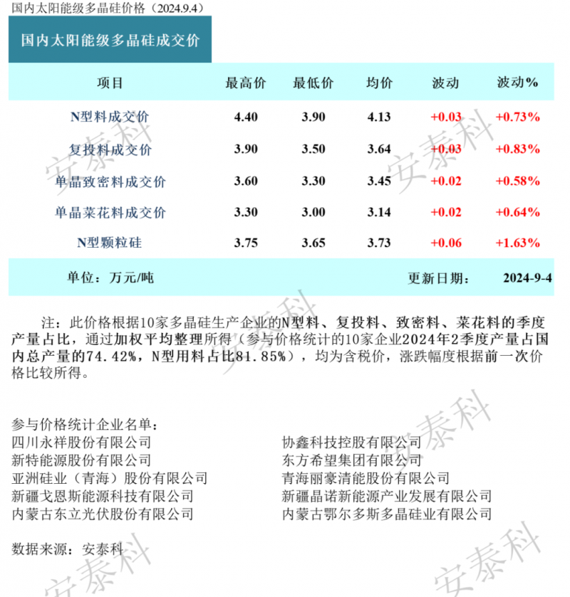 其中,n型棒狀硅成交價格最低為3.90萬元/噸,最高為4.40萬元/噸,均價為4.13萬元/噸,環比上漲0.73%;