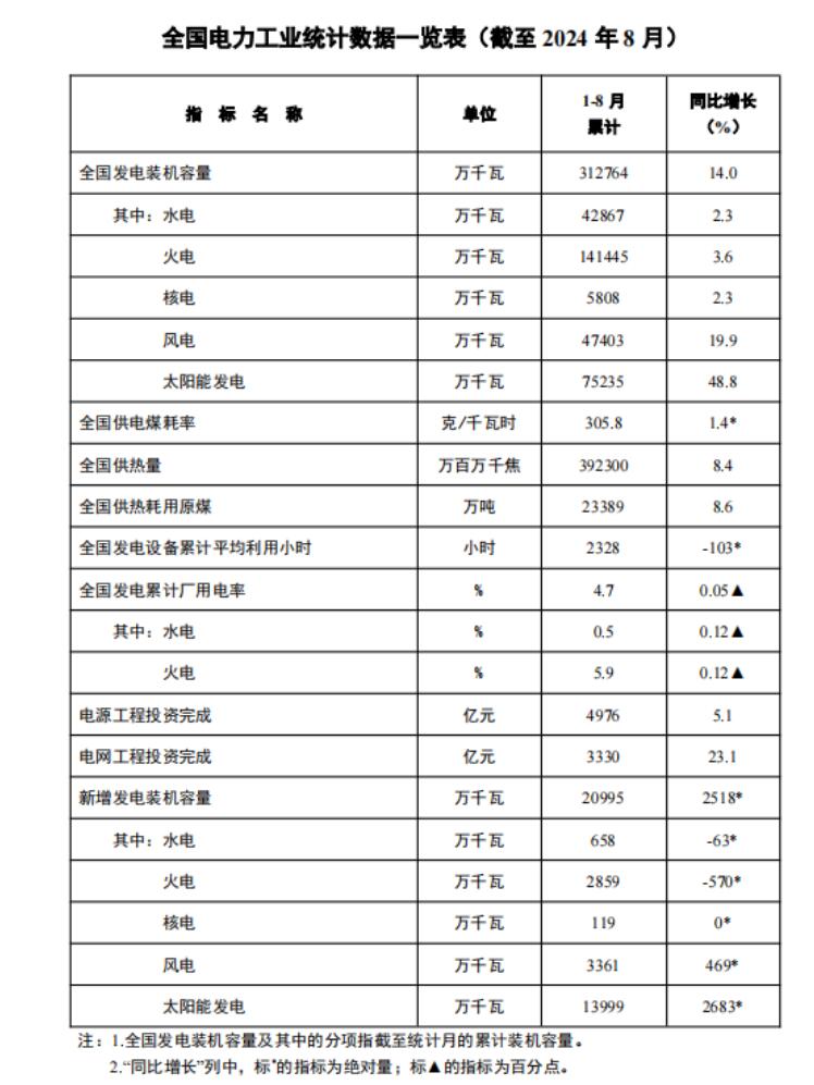 截至8月底,全國累計發(fā)電裝機容量約31.3億千瓦,同比增長14.0%。其中,太陽能發(fā)電裝機容量約7.5億千瓦,同比增長48.8%;風電裝機容量約4.7億千瓦,同比增長19.9%。