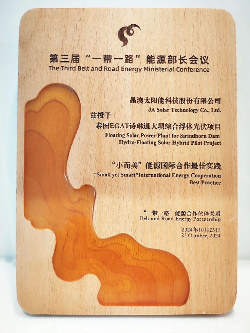 期間,晶澳科技供貨全部組件的“泰國EGAT詩琳通大壩綜合浮體光伏項(xiàng)目”榮獲“一帶一路”能源國際合作最佳實(shí)踐獎(jiǎng),山東省委常委、副省長、省政府黨組副書記張海波親自頒獎(jiǎng),晶澳科技全球化與政府關(guān)系辦公室主任喻敏登臺(tái)領(lǐng)獎(jiǎng)。在此次所有獲獎(jiǎng)案例中,晶澳科技是唯一一個(gè)獲得智能創(chuàng)新類最佳實(shí)踐獎(jiǎng)的光伏制造企業(yè)。