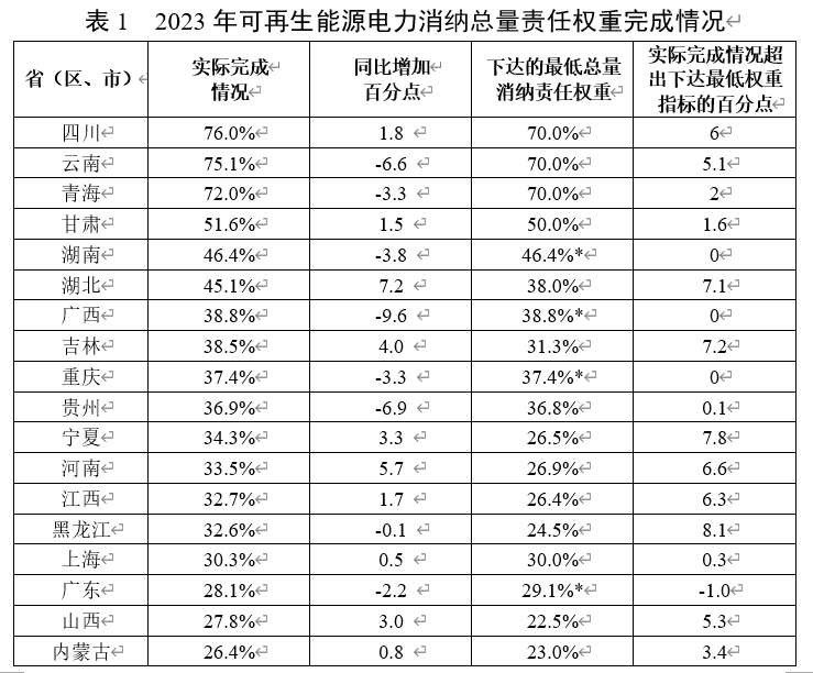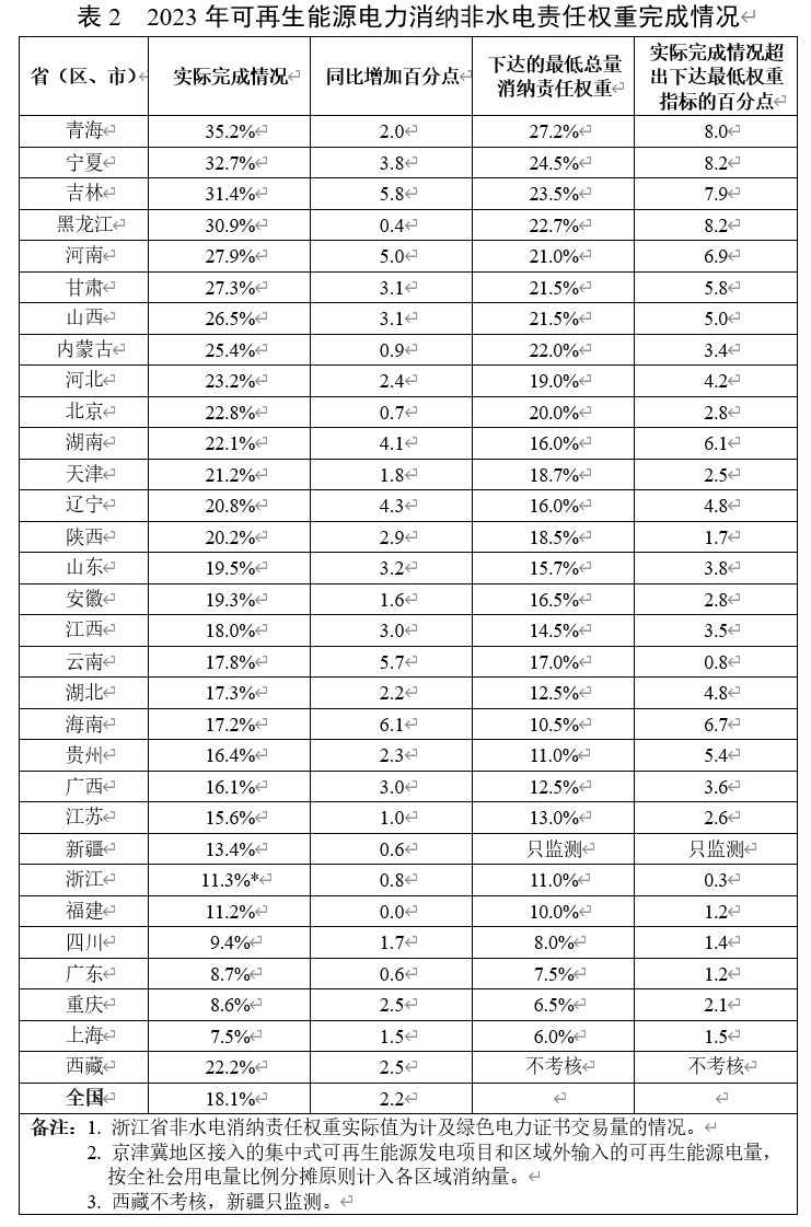 根據(jù)《國家發(fā)展改革委辦公廳國家能源局綜合司關于2023年可再生能源電力消納責任權重及有關事項的通知》(發(fā)改辦能源〔2023〕569號),綜合考慮各省本地生產(chǎn)、本地利用以及外來電力消納情況,全國各省(自治區(qū)、直轄市)可再生能源電力消納責任權重總體完成較好,具體完成情況如下。