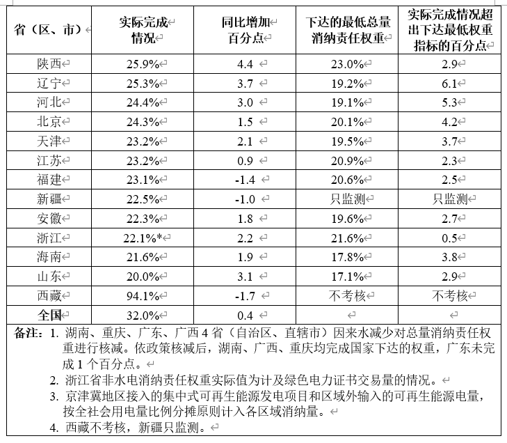 二、各省(區(qū)、市)可再生能源電力消納責任權重完成情況
