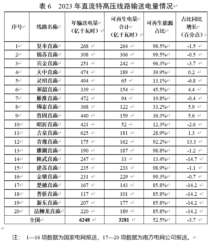 2023年,20條直流特高壓線路年輸送電量6248億千瓦時,其中可再生能源電量3281億千瓦時,同比提高3.6%,可再生能源電量占全部直流特高壓線路總輸送電量的52.5%。國家電網(wǎng)運營的16條直流特高壓線路總輸送電量5537億千瓦時,其中可再生能源電量2672億千瓦時,占總輸送電量的48.3%;南方電網(wǎng)運營的4條直流特高壓線路輸送電量711億千瓦時,其中可再生能源電量610億千瓦時,占總輸送電量的85.8%。