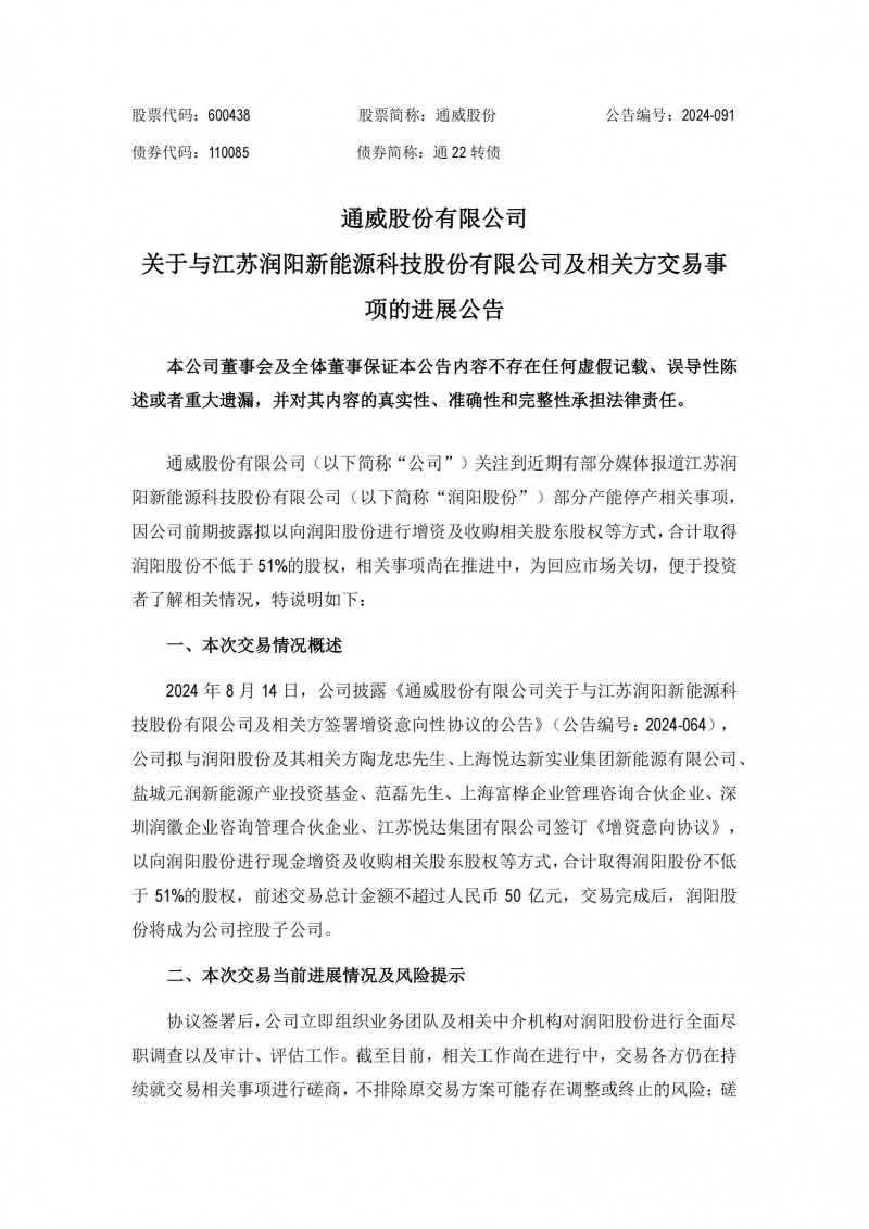 通威股份在公告中表示,雙方協議簽署后,公司立即組織業務團隊及相關中介機構對潤陽股份進行全面盡職調查以及審計、評估工作。截至目前,相關工作尚在進行中,交易各方仍在持續就交易相關事項進行磋商,不排除原交易方案可能存在調整或終止的風險;磋商過程中,交易各方也同步在積極探討其他整合方案,如有確定進展或變化,公司將及時披露。
