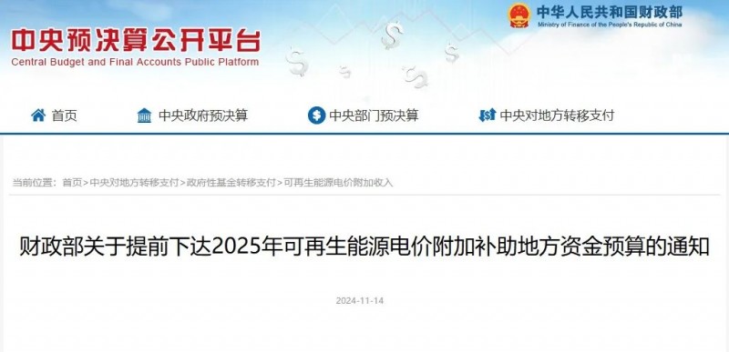 財(cái)政部關(guān)于提前下達(dá)2025年可再生能源電價附加補(bǔ)助地方資金預(yù)算的通知