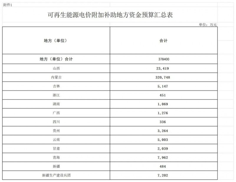 以下是本次可再生能源電價附加補(bǔ)助地方資金預(yù)算匯總表:
