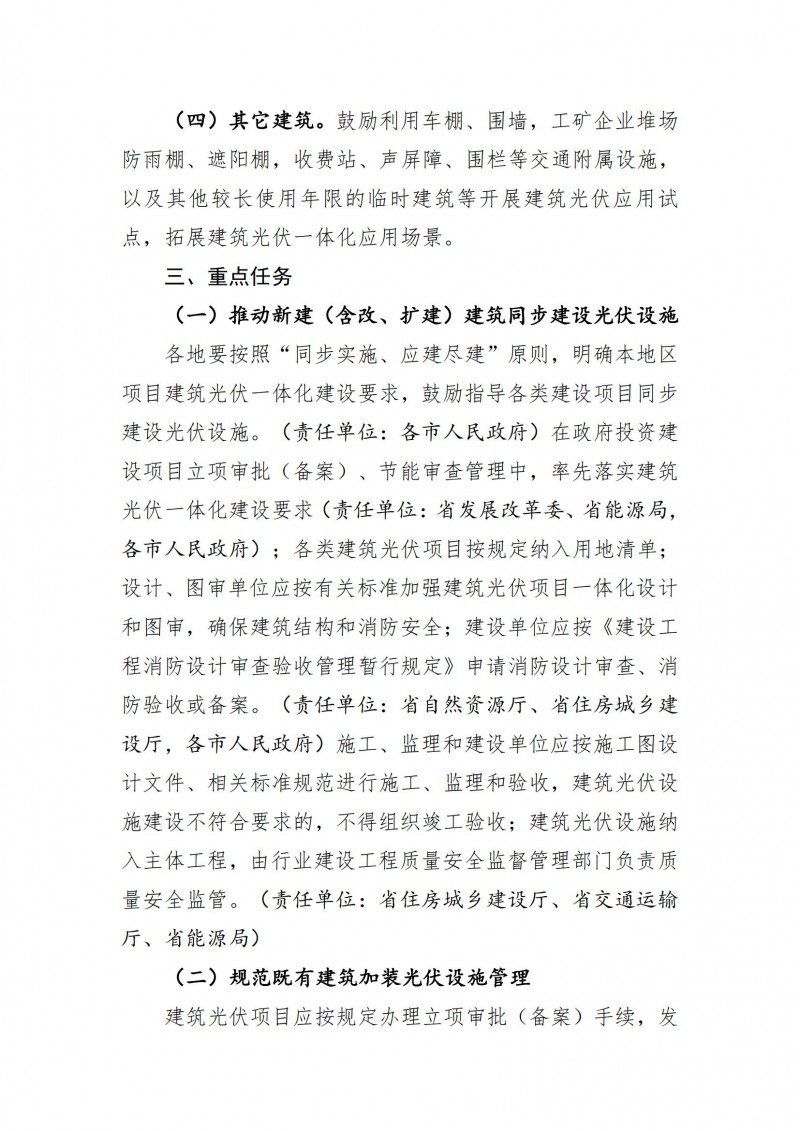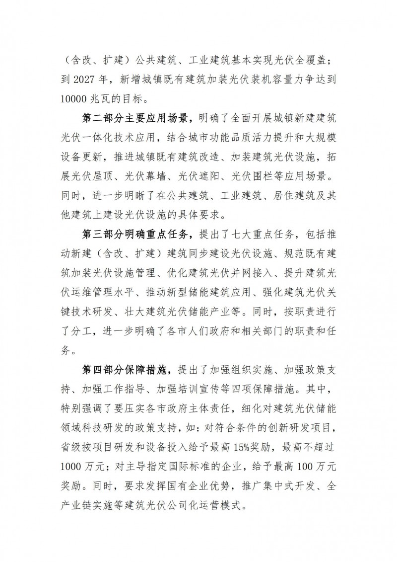 2025年起,建筑光伏納入全省新能源發展總體規模,統籌開發利用,政府投資具備條件的城鎮新建(含改、擴建)公共建筑、工業建筑基本實現光伏全覆蓋,其他建筑光伏能建盡建,基本形成政府引導、企業參與、市場運作、多方共贏的建筑光伏開發建設運營模式。