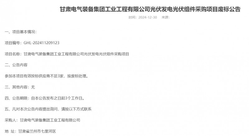 近日,甘肅電氣裝備集團工業(yè)工程有限公司光伏發(fā)電光伏組件采購項目廢標公告發(fā)布,公告顯示,因參加本項目有效投標供應(yīng)商不足3家,該光伏組件采購項目按廢標處理。