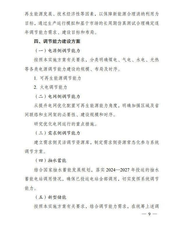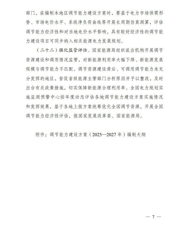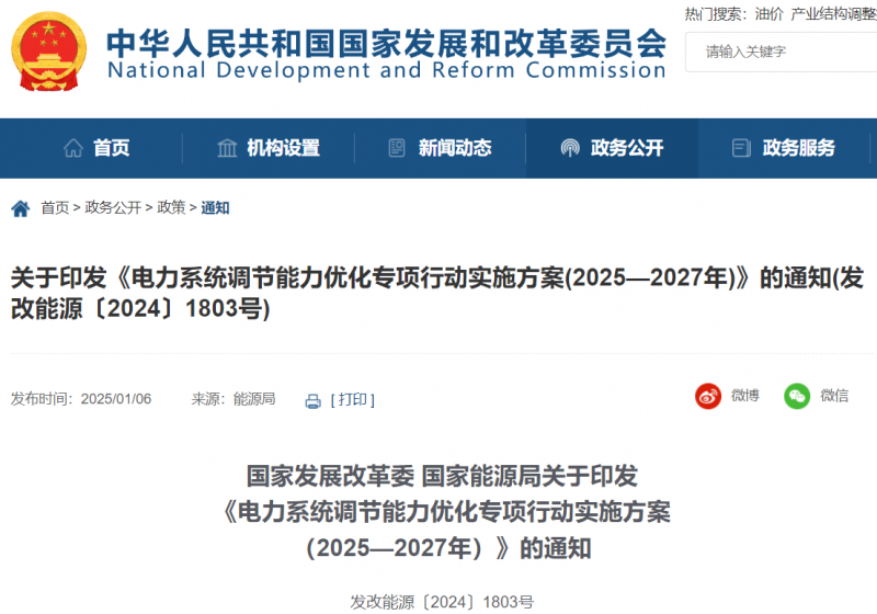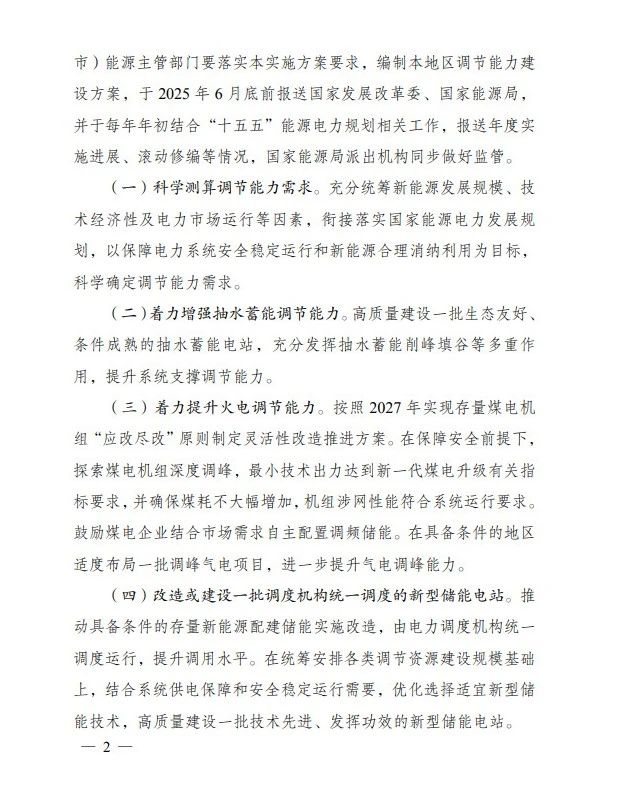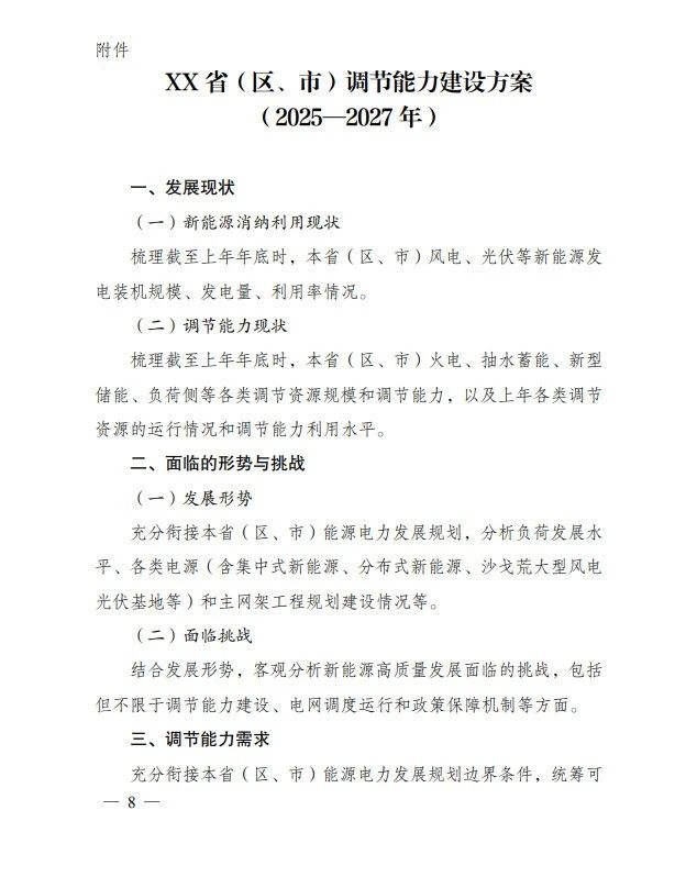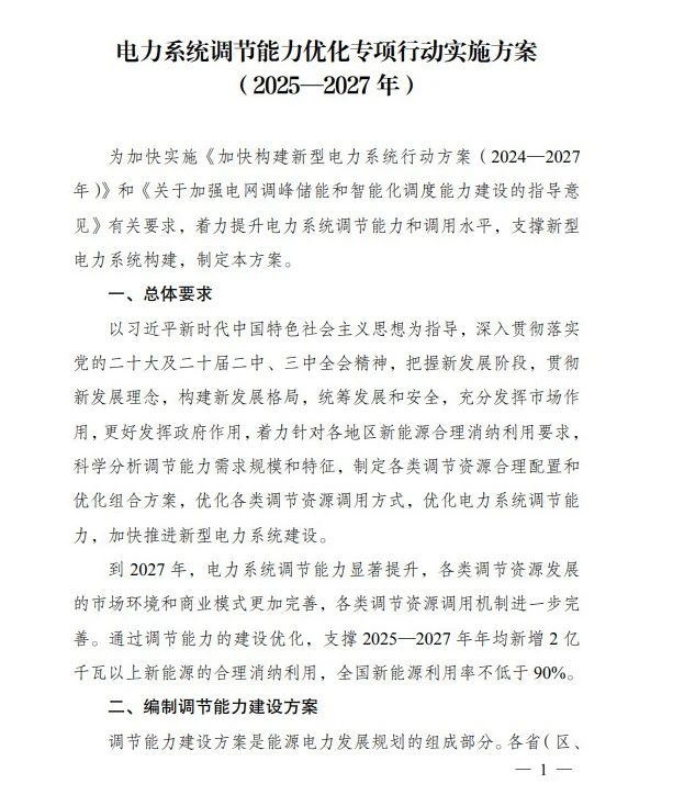 為進一步落實《加快構建新型電力系統(tǒng)行動方案(2024—2027年)》和《關于加強電網調峰儲能和智能化調度能力建設的指導意見》,著力提升電力系統(tǒng)調節(jié)能力和調用水平,有效支撐新能源消納利用,國家發(fā)展改革委、國家能源局制定了《電力系統(tǒng)調節(jié)能力優(yōu)化專項行動實施方案(2025—2027年)》。現(xiàn)印發(fā)給你們,請認真組織落實,因地制宜推進調節(jié)能力建設。