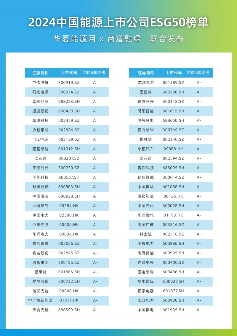 在本屆大會上,華夏能源網與商道融綠聯合發布了《榜樣的力量:2024中國能源上市公司ESG50報告》,這是國內首個專注于能源上市公司的ESG榜單報告。報告選取了申萬行業分類中能源相關的639家上市公司為研究對象,基于商道融綠ESG評級結果,最終評選出50家ESG綜合績效領先的優秀能源上市公司,他們代表了能源行業的責任擔當和善治未來。