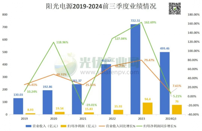從已公布的2024前三季度業績來看,陽光電源的盈利水平毋庸置疑。據統計,2024年前三季度陽光電源營收近500億,已超過2022年全年營收總額,以下是2019——2024(Q1-Q3)陽光電源的六年業績統計詳表: