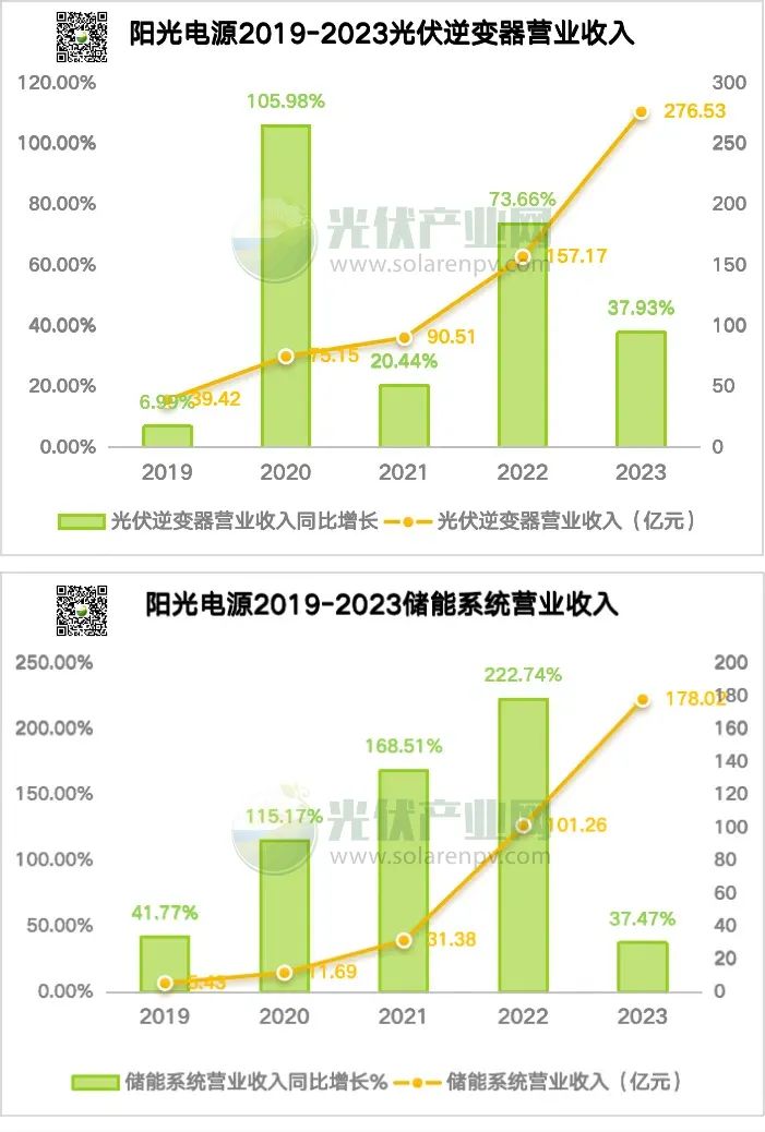 從陽光電源整體的盈利板塊來看,不管是光伏逆變器還是儲能系統的營業收入在行業內部都是遙遙領先。