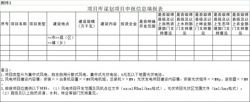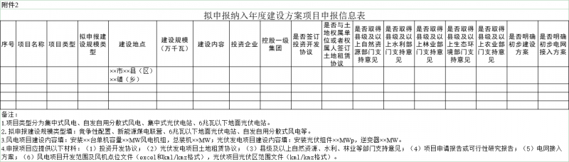 (二)擬申報納入年度建設方案項目:填報項目申報信息包括項目名稱、建設地點、建設內容與規模、投資主體、投資開發協議簽訂情況、用地落實情況、取得相關部門支持性文件情況、建設方案編制情況、初步電網接入方案、擬通過何種方式取得建設規模等(附件2)。