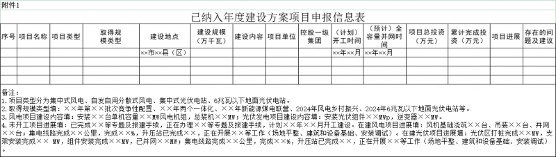 (一)已納入年度建設方案項目:填報項目申報信息包括項目名稱、建設地點、建設內容與規模、投資主體、項目總投資及完成投資情況、開工時間、預計全容量并網時間、建設進度(若滯后需說明原因)、項目建設過程中的主要困難與問題、相關建議等(附件1)。