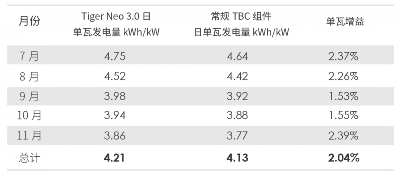 數據顯示,在2024年7月-11月測試期間,TigerNeo3.0組件日平均發電4.21kWh/kW,TBC組件日平均發電4.13kWh/kW,發電量增益為2.04%。這一結果充分證明了晶科TOPCon技術TigerNeo3.0組件在高效發電方面的顯著優勢。