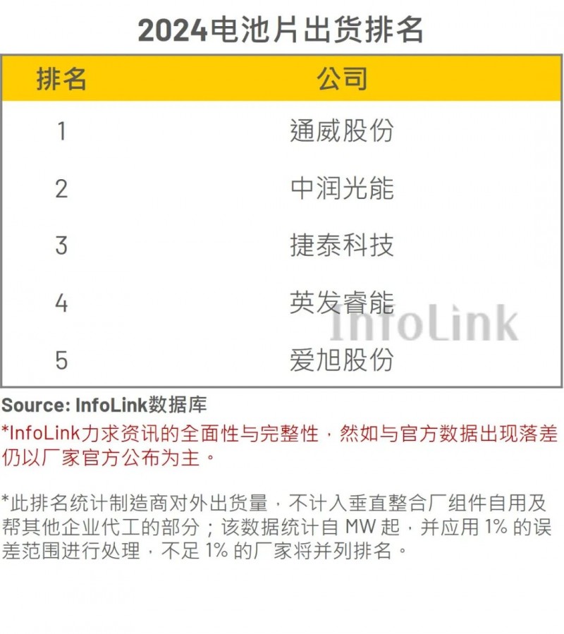 Infolink指出,本次榜單中的五家企業,2024全年電池片總出貨量達162.8GW。其中,PERC電池片累計出貨約53.5GW,而TOPCon電池片則加速趕超,累計出貨達109.3GW,占總出貨量的67%。