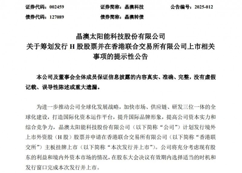 2月21日,晶澳科技(SZ:002459)發布公告,為進一步推動公司全球化發展戰略,加快市場、供應鏈、研發三位一體的全球化建設,打造國際化資本運作平臺,提升國際品牌形象,提高公司資本實力和綜合競爭力,公司計劃發行境外上市外資股(H股)股票并申請在香港聯合交易所有限公司主板掛牌上市。