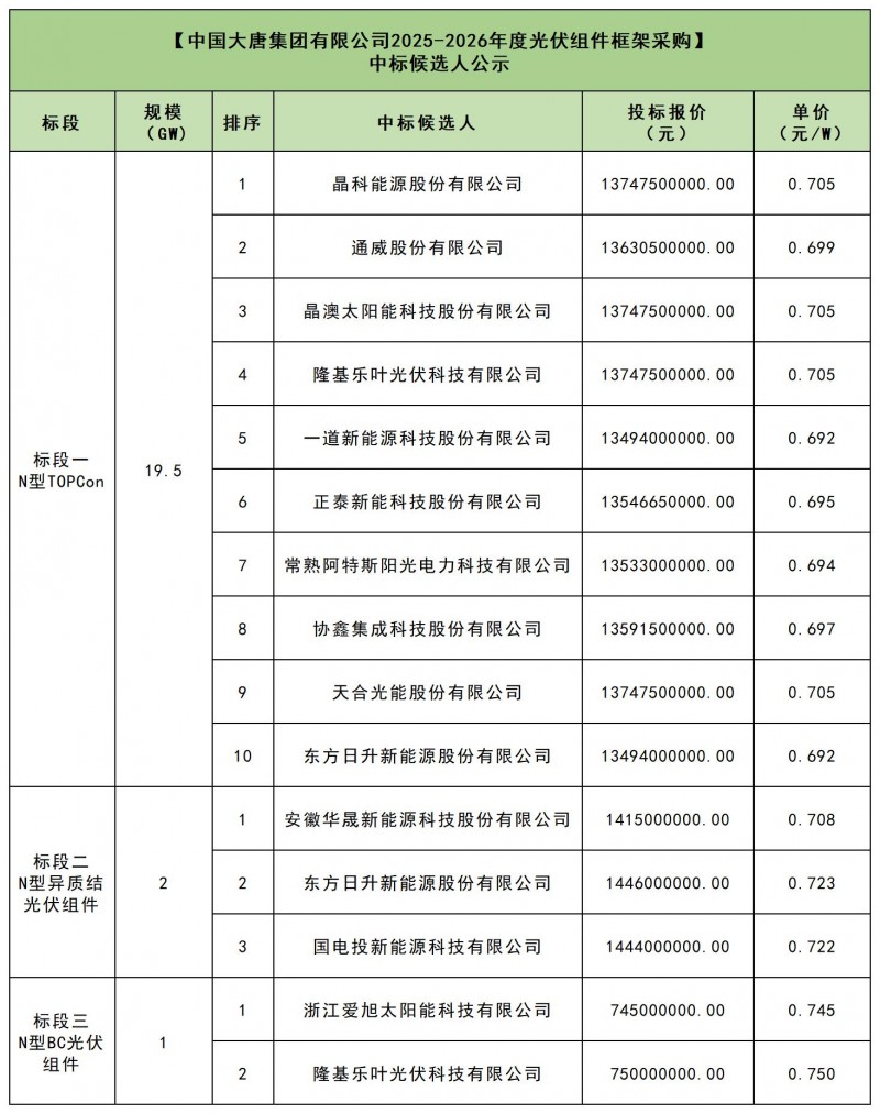 3月5日,大唐集團2025-2026年度22.5GW光伏組件框架采購中標候選人公示。本次項目共分為3個標段,其中標段一TOPCon組件單價為0.692~0.705元/W,Top4組件企業(yè)報價均為0.705元/W;標段二HJT組件單價為0.708~0.723元/W,標段三BC組件的單價為0.745元/W、0.75元/W。
