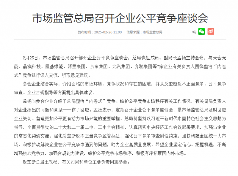 2月25日,市場監(jiān)管總局召開部分企業(yè)公平競爭座談會,天合光能、晶澳科技、隆基綠能等7家企業(yè)有關(guān)負責人圍繞整治“內(nèi)卷式”競爭進行深入交流。
