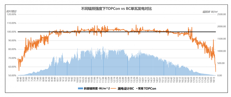 1、 TOPCon弱光下的發(fā)電表現(xiàn)顯著優(yōu)于漏電設計BC組件
