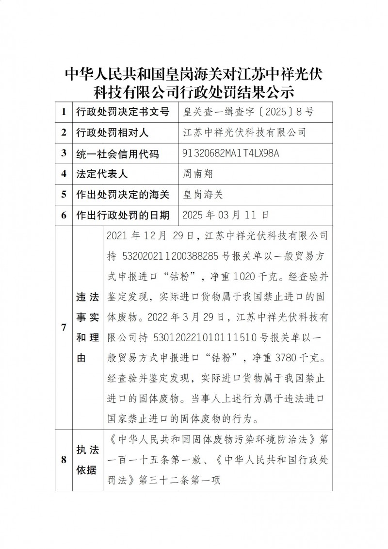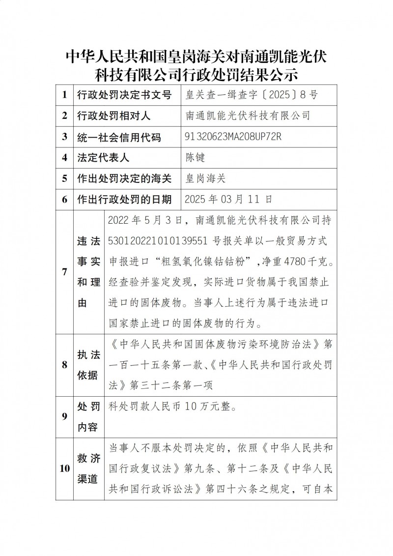 其中,南通凱能光伏科技有限公司于2022年5月3日,南通凱能光伏科技有限公司持530120221010139551號報關單以一般貿易方式申報進口“粗氫氧化鎳鈷鈷粉”,凈重4780千克。經查驗并鑒定發現,實際進口貨物屬于我國禁止進口的固體廢物。當事人上述行為屬于違法進口國家禁止進口的固體廢物的行為,被處罰款人民幣10萬元整。