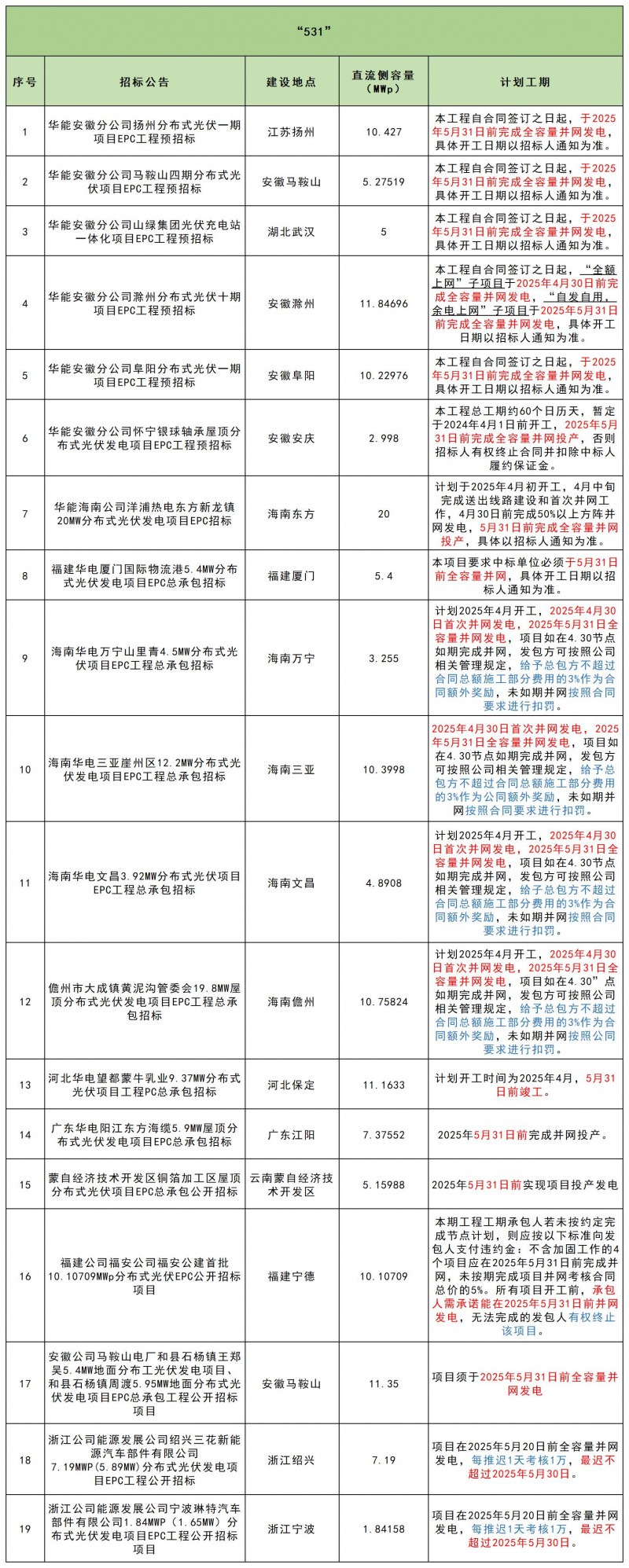 3月15日華能發布的【華能安徽分公司揚州分布式光伏一期項目EPC工程預招標】、【華能安徽分公司馬鞍山四期分布式光伏項目EPC工程預招標】、【華能安徽分公司馬鞍山四期分布式光伏項目EPC工程預招標】等招標公告中,皆明確于2025年5月31日前完成全容量并網發電。
