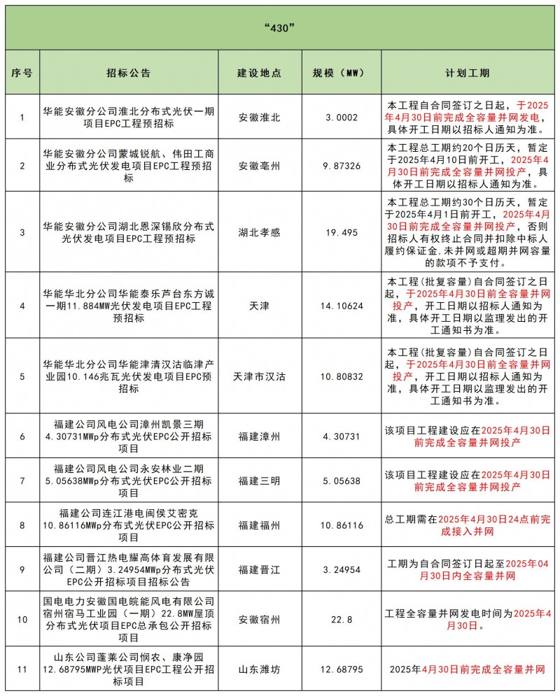 3月15日華能發布的【華能安徽分公司淮北分布式光伏一期項目EPC工程預招標】、【華能安徽分公司蒙城銳航、偉田工商業分布式光伏發電項目EPC工程預招標】等招標公告中,則明確于2025年4月30日前完成全容量并網發電。