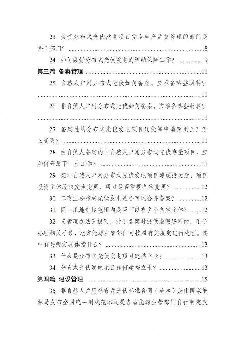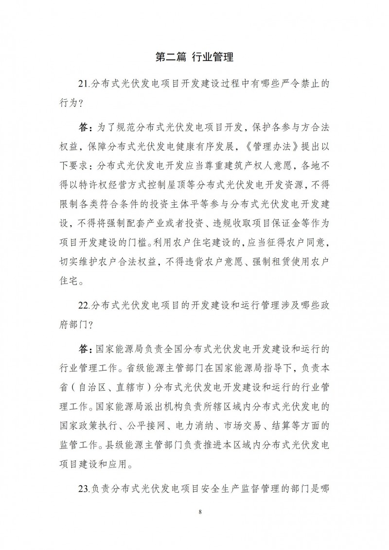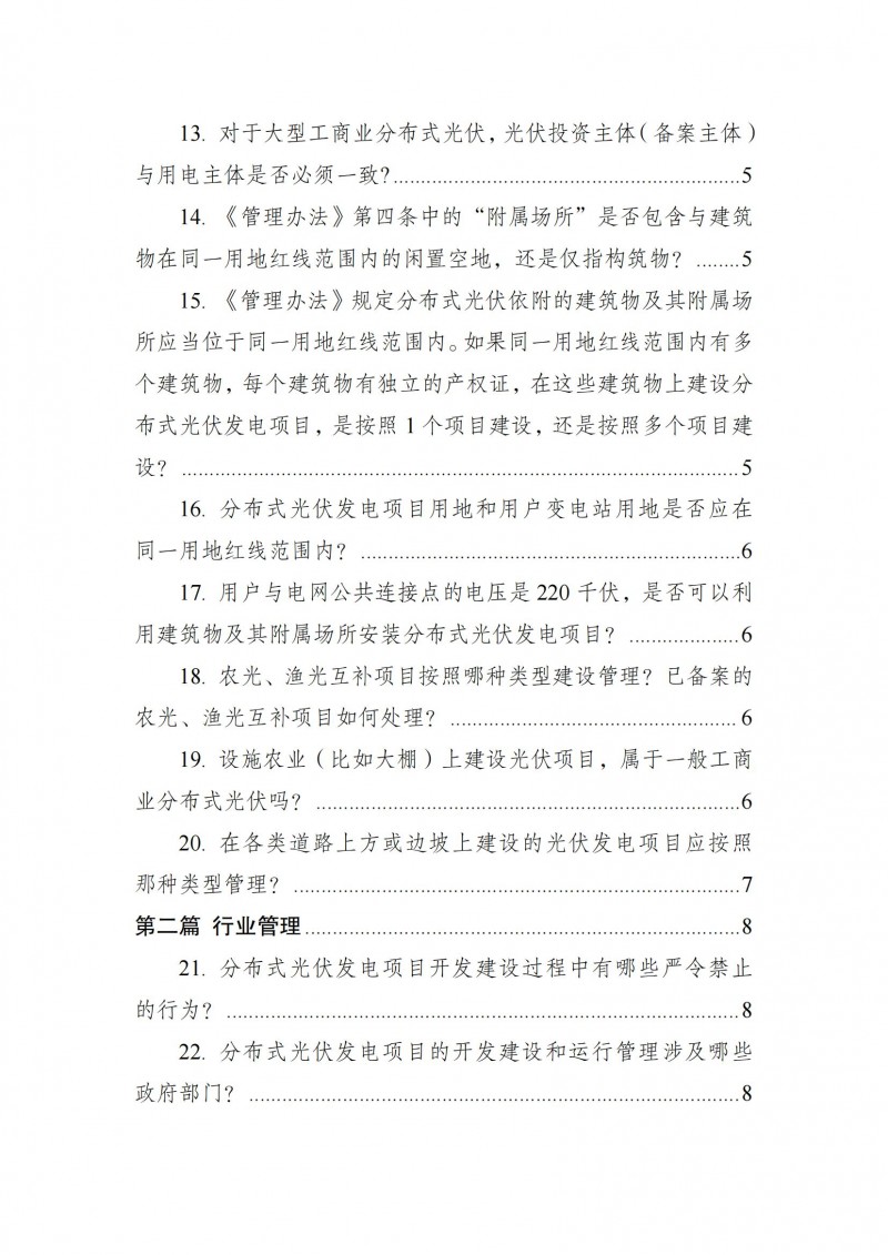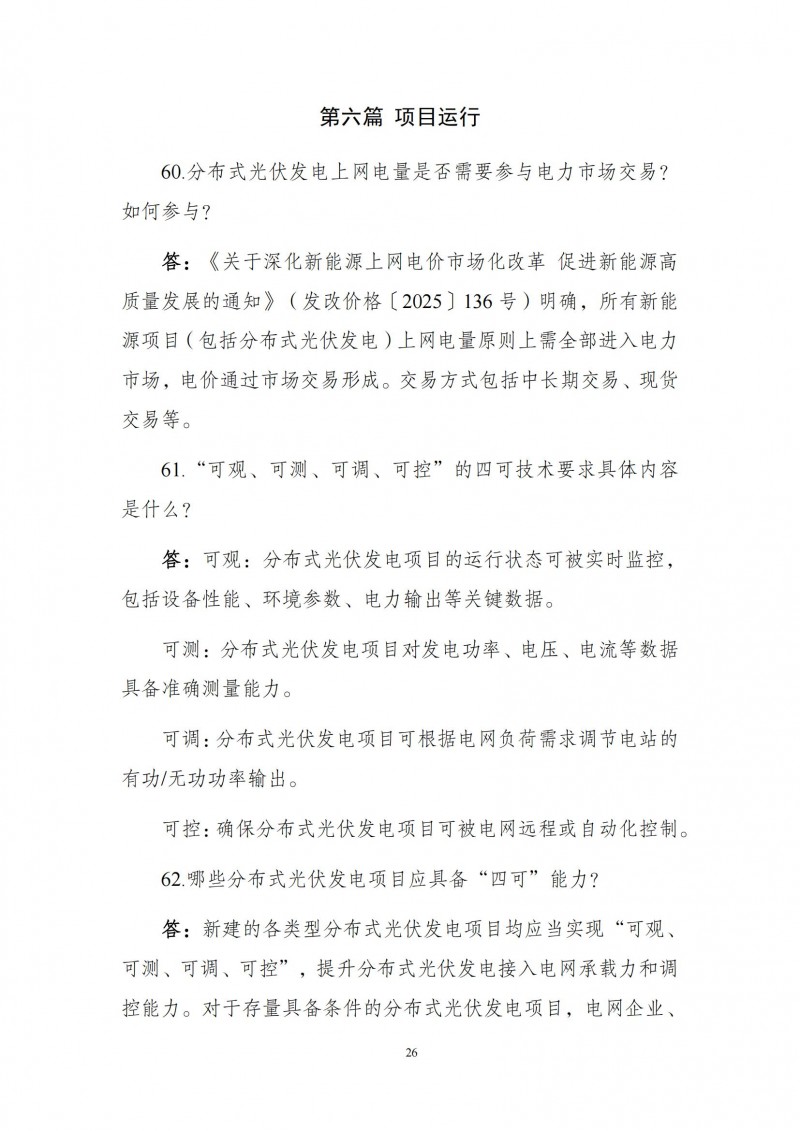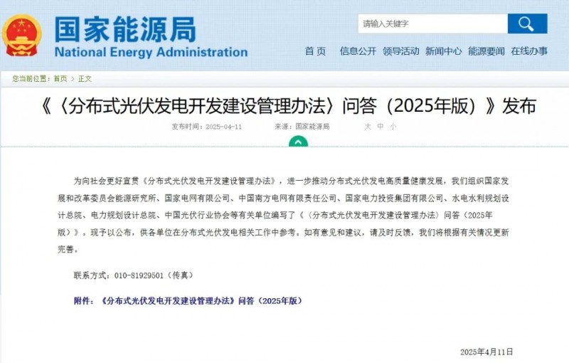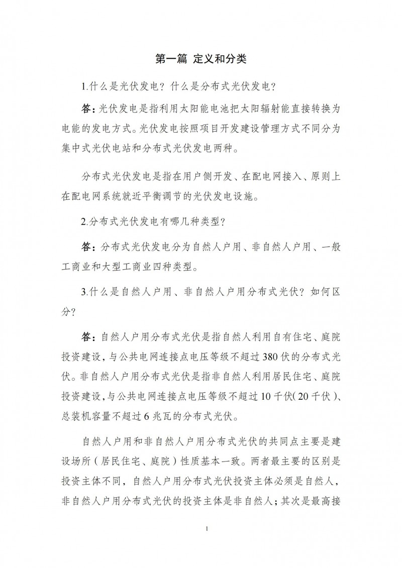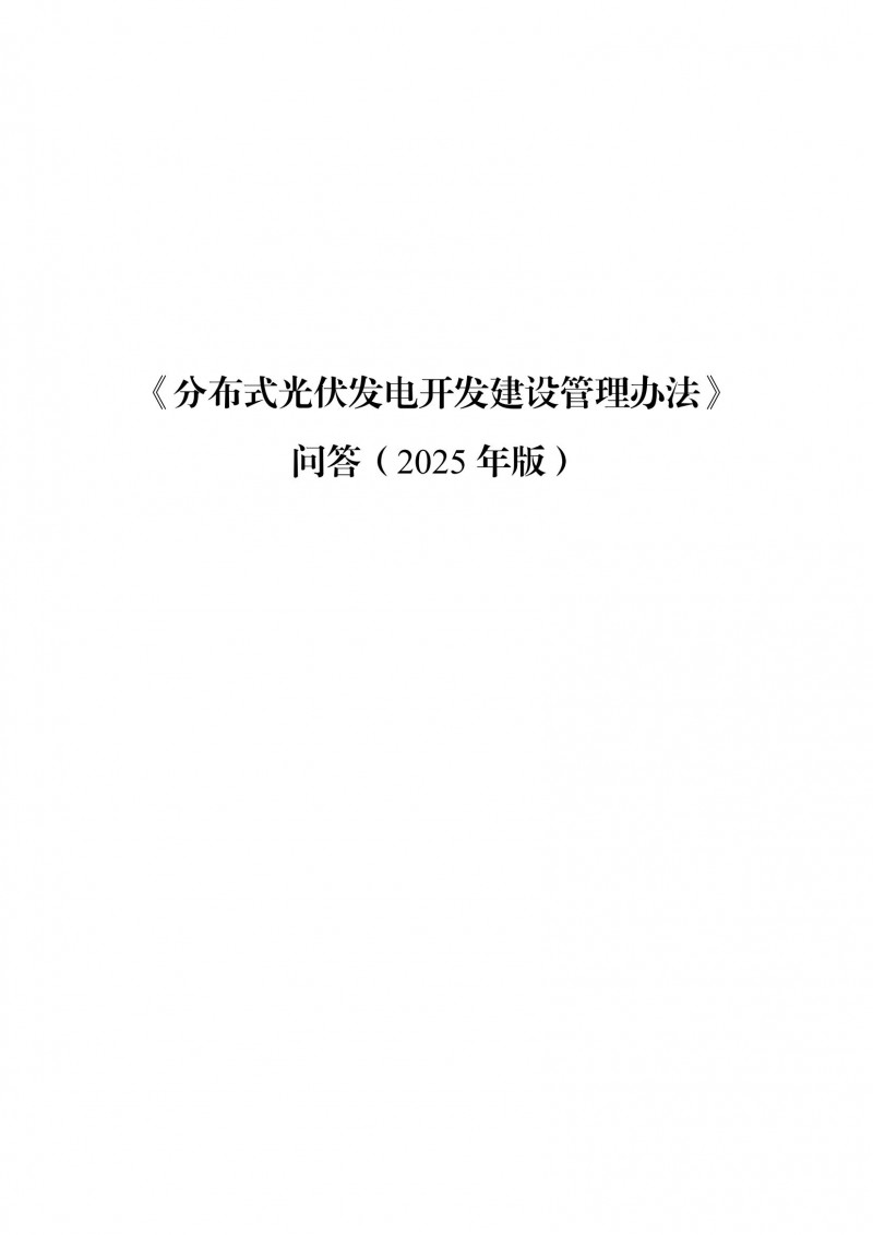 為向社會更好宣貫《分布式光伏發(fā)電開發(fā)建設管理辦法》,進一步推動分布式光伏發(fā)電高質(zhì)量健康發(fā)展,我們組織國家發(fā)展和改革委員會能源研究所、國家電網(wǎng)有限公司、中國南方電網(wǎng)有限責任公司、國家電力投資集團有限公司、水電水利規(guī)劃設計總院、電力規(guī)劃設計總院、中國光伏行業(yè)協(xié)會等有關單位編寫了《〈分布式光伏發(fā)電開發(fā)建設管理辦法〉問答(2025年版)》。現(xiàn)予以公布,供各單位在分布式光伏發(fā)電相關工作中參考。如有意見和建議,請及時反饋,我們將根據(jù)有關情況更新完善。
