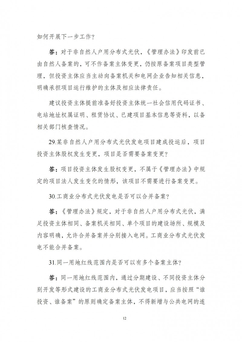 答:同一用地紅線范圍內(nèi),通過分期建設、不同投資主體分別開發(fā)等形式建設的工商業(yè)分布式光伏發(fā)電項目,應當按照“誰投資、誰備案”的原則確定備案主體,不得新增與公共電網(wǎng)的連接點。