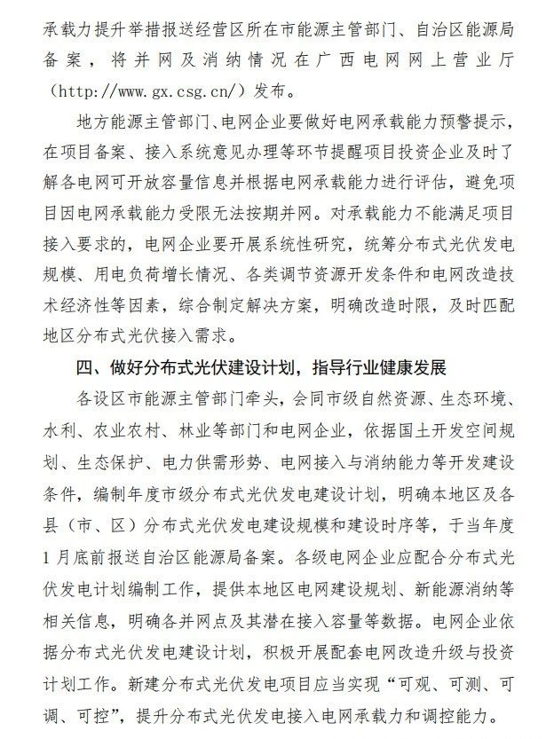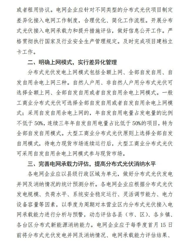 據征求意見稿內容顯示,文件明確上網模式,實行差異化管理。分布式光伏發電上網模式包括全額上網、全部自發自用、自發自用余電上網三種。自然人戶用、非自然人戶用分布式光伏可選擇全額上網、全部自發自用或者自發自用余電上網模式。其中,一般工商業分布式光伏可選擇全部自發自用或者自發自用余電上網模式;采用自發自用余電上網的,年自發自用電量占發電量的比例不低于50%,連續三年年自發自用電量占比低于50%的項目,轉為全部自發自用模式。