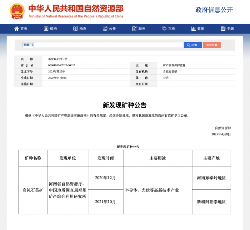 日前,自然資源部發布《新發現礦種公告》,經國務院批復,高純石英礦正式成為我國第174號新礦種。而高純石英礦對半導體、光伏等高新產業不可或缺。