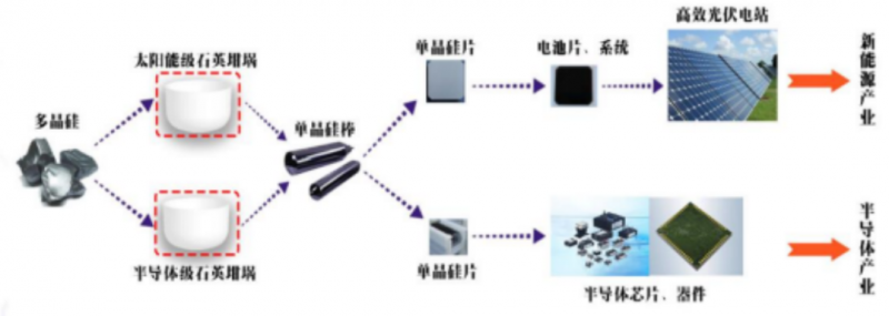 在光伏產業領域,高純度石英砂是下游硅片制造的“剛需”耗材——石英坩堝的主要原材料。石英坩堝是由高純石英砂高溫制作而成的一種容器,主要用來盛裝熔融硅并制作成晶棒,對單晶硅的生產成本和產品產量質量都有直接影響。