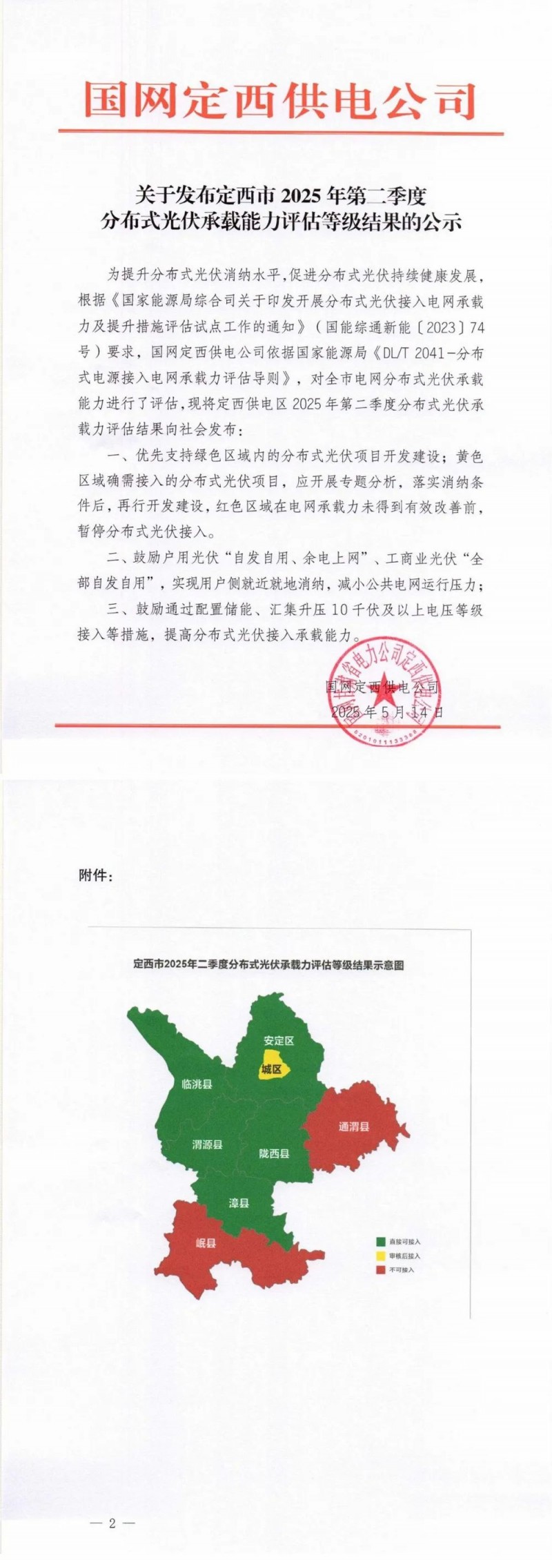 5月14日,甘肅省定西市發(fā)改委公示了定西市2025年第二季度分布式光伏承載能力評(píng)估等級(jí)結(jié)果