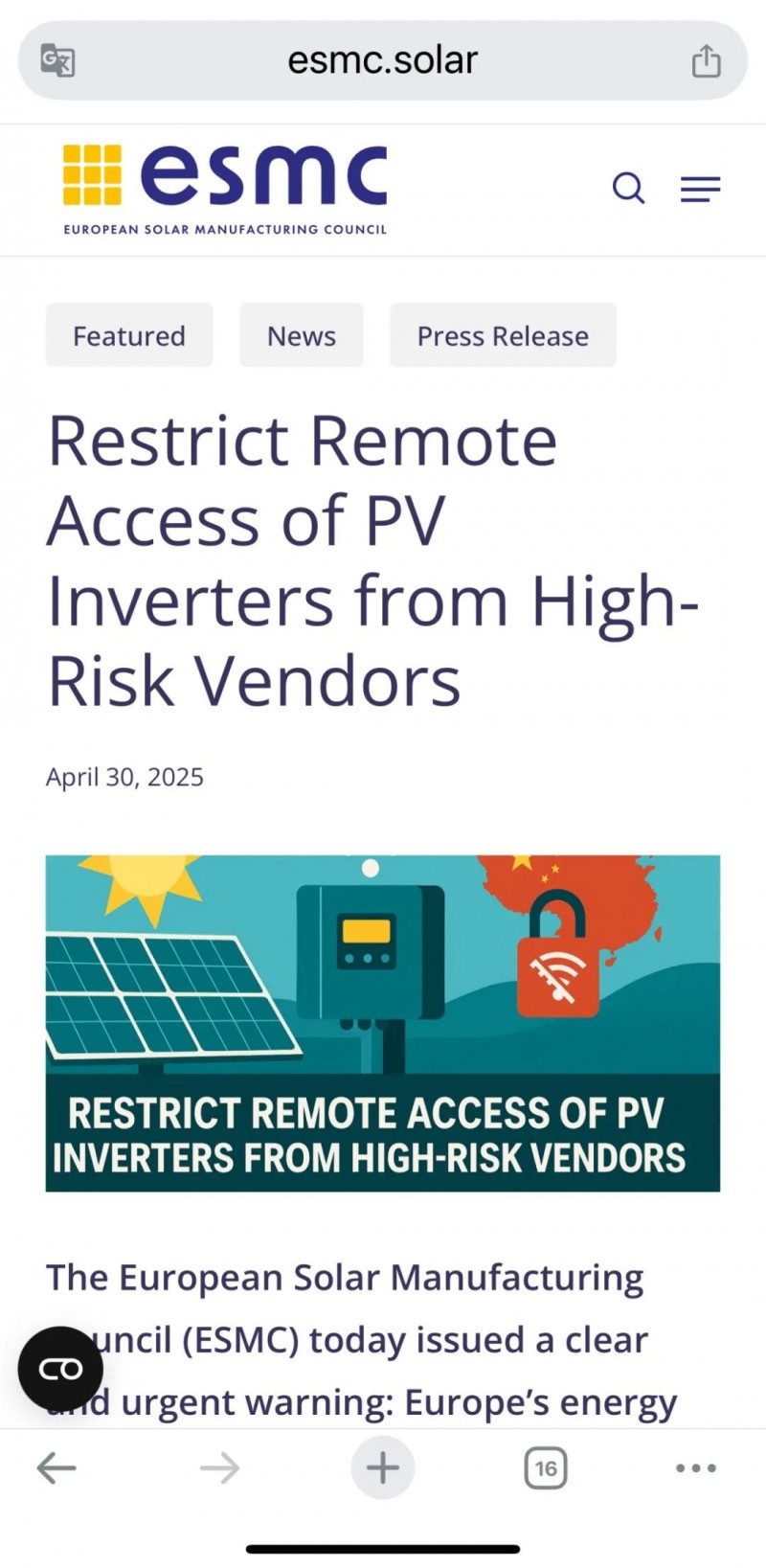 但此次歐洲太陽能制造委員會(ESMC)的公開表態,又把這一場“無稽之談”重新推向到熱議中。該組織在自己的官方網站和領英等其他社媒平臺均發布了有關《Restrict Remote Access of PV Inverters from High-Risk Vendors》(限制高風險供應商光伏逆變器的遠程訪問)等主題文章,這里的高風險供應商主要就是指的中國企業。