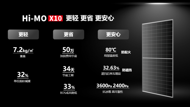 Hi-MO X10輕質雙防組件的推出,為低載荷屋頂提供了“輕量、高效、安全”的一站式解決方案,以技術創新加速“雙碳”目標落地,引領光伏行業向場景化、精細化升級。