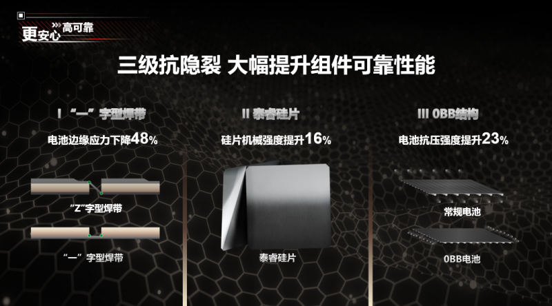 技術護航:HPBC 2.0技術以泰睿硅片提升機械強度16%,結合一字型焊帶(電池邊緣應力降48%)與0BB結構(抗壓能力提升23%),保障長期可靠性。