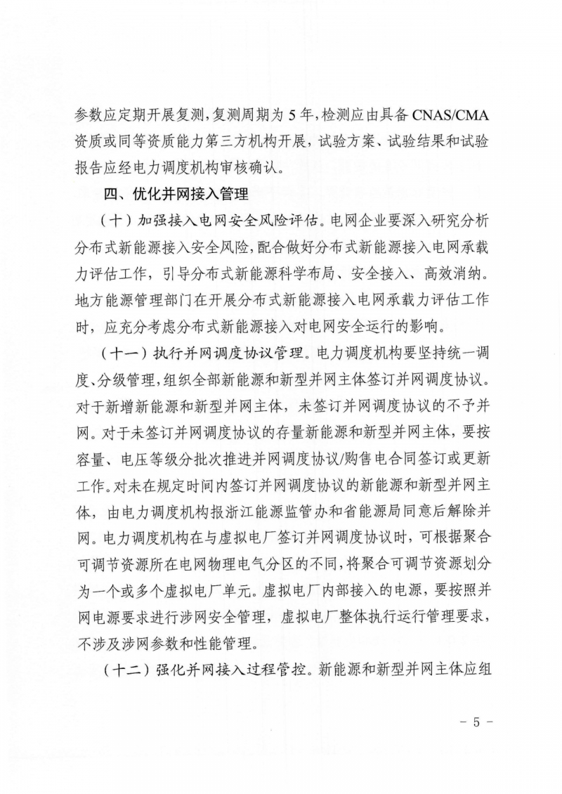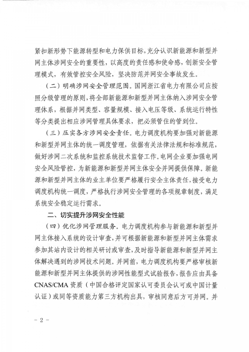 文件明確了涉網安全管理范圍。國網浙江省電力有限公司應按照分級管理的原則,將全部新能源和新型并網主體納入涉網安全管理體系,根據并網類型、容量規模、接入電壓等級、系統運行特性等分類提出相應涉網管理具體要求,把必須管住的管到位。