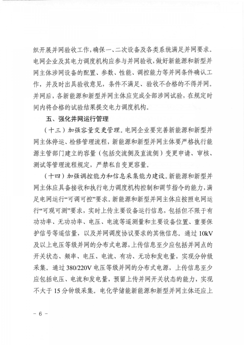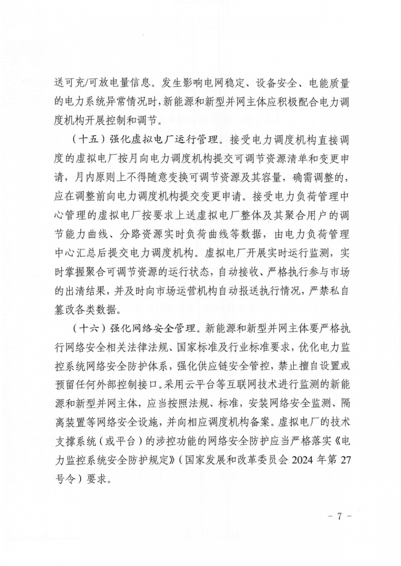 在并網運行管理中,文件強調,電化學儲能新能源和新型并網主體還應上送可充/可放電量信息。發生影響電網穩定、設備安全、電能質量的電力系統異常情況時,應積極配合電力調度機構開展控制和調節。虛擬電廠開展實時運行監測,實施掌握聚合可調節資源的運行狀態,自動接收、嚴格執行參與市場的出清結果,并及時向市場運營機構自動報送執行情況,嚴謹私自篡改各類數據。