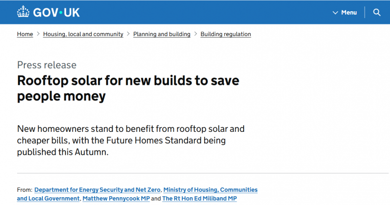 本月初,英國(guó)政府能源大臣Ed Miliband確認(rèn)了,即將出臺(tái)的《未來(lái)住宅標(biāo)準(zhǔn)》將使英格蘭地區(qū)的新建住宅“幾乎全部”安裝太陽(yáng)能電池板,僅限光伏安裝對(duì)能效提升毫無(wú)作用的“極特殊情況”可豁免。蘇格蘭、威爾士和北愛爾蘭的建筑法規(guī)由當(dāng)?shù)刈孕兄贫ā?/div>