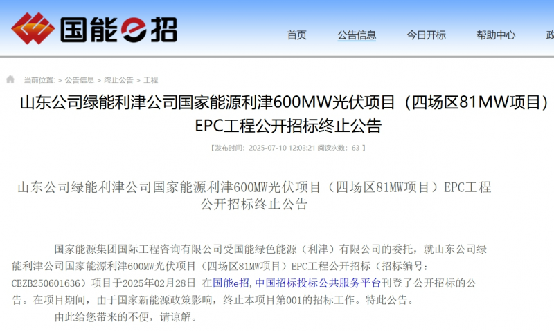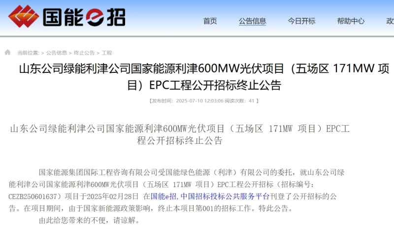 7月10日,國家能源集團招標平臺發布了關于3個光伏項目EPC工程公開招標終止的公告,總容量共計352MW。分別為利津600MW光伏項目(