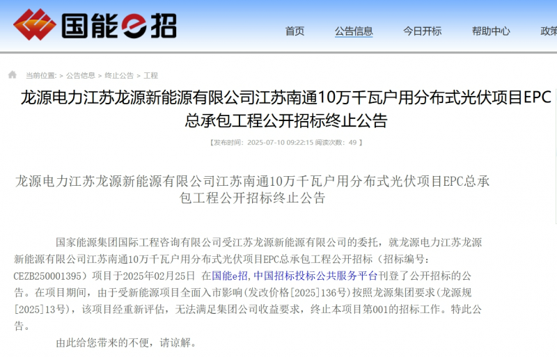 7月10日,國家能源集團招標平臺發布了關于3個光伏項目EPC工程公開招標終止的公告,總容量共計352MW。