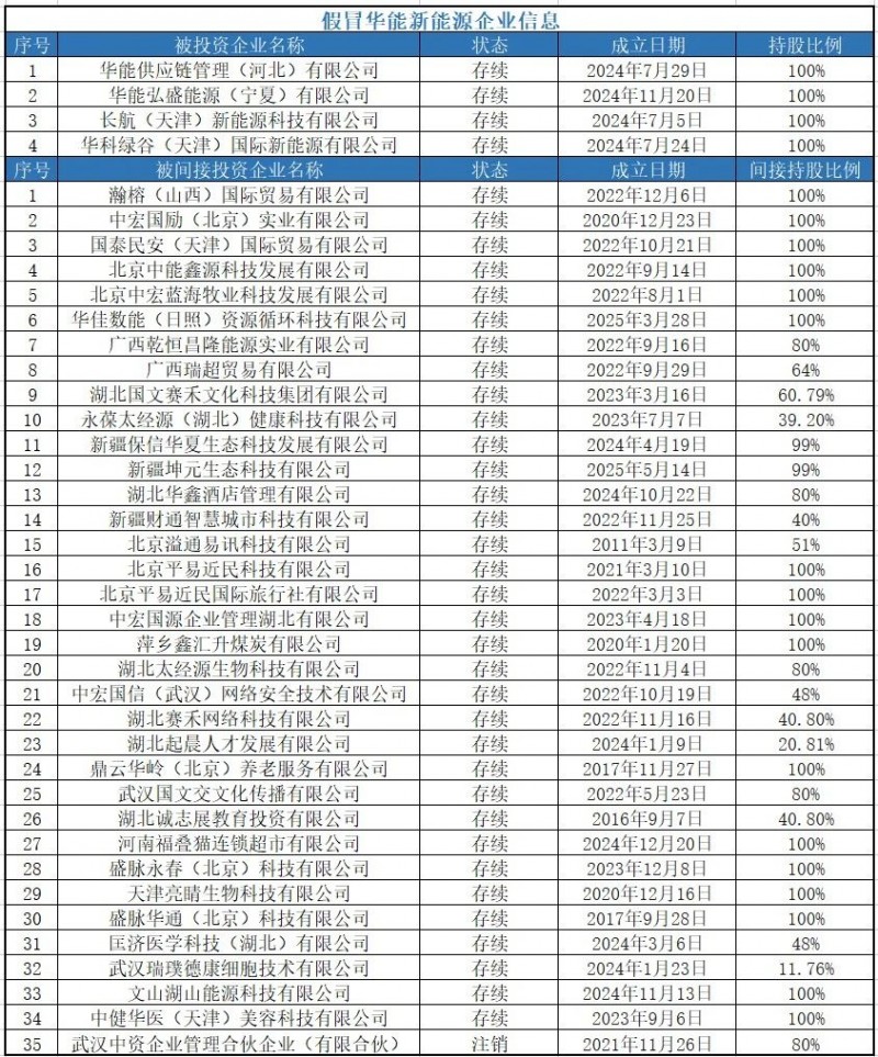 一、華能新能源及所屬企業與華能科技能源有限公司(含其所出資企業)不存在任何股權出資關系,也不存在任何形式的隸屬、關聯、管理或實際控制等關系。華能科技能源有限公司在中國大陸工商系統登記的相關企業,包括華能供應鏈管理(河北)有限公司、華能弘盛能源(寧夏)有限公司、長航(天津)新能源科技有限公司、華科綠谷(天津)國際新能源有限公司等,及再投資企業(附表)。華能科技能源有限公司及其關聯企業、人員的任何市場經營活動均與華能新能源及所屬企業沒有任何關系,如因華能科技能源有限公司等違法行為導致您利益受損,我公司不承擔相關責任。
