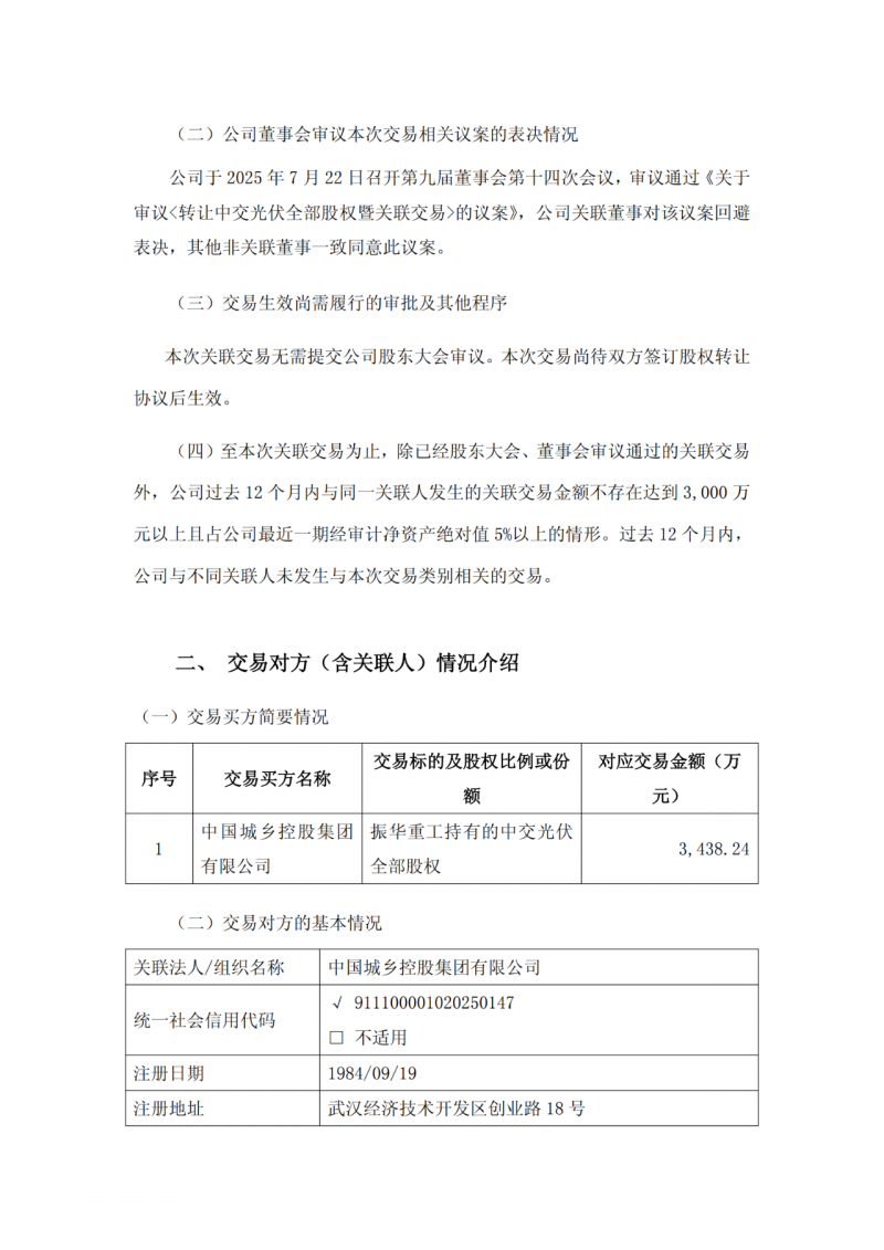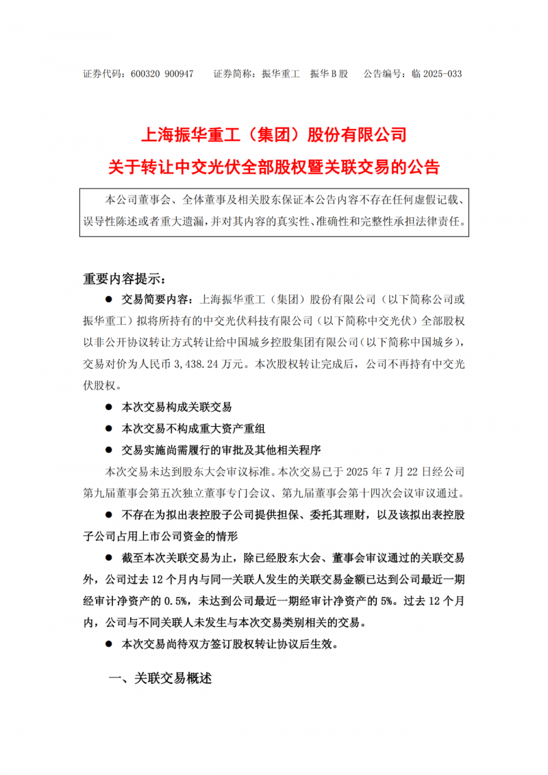 7月23日,振華重工發布公告,公司擬將所持有的中交光伏科技有限公司全部股權以非公開協議轉讓方式轉讓給中國城鄉控股集團有限公司,交易對價為人民幣3,438.24萬元。