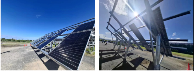 本次項目在日本鹿兒島實證基地進行,采用固定支架安裝(傾角32°,距地高度1.2米),每組技術(晶科能源N型TOPCon組件與最新N型BC組件)各配置兩塊來自不同廠家的樣本。組件初始功率采用SAT方法測量,測試結果未經光譜校正。發電量(直流,DC)數據通過高精度CR1000X采集系統獲取,采樣間隔為1分鐘。同時,以相同間隔記錄了組件平面輻照度、背板溫度、環境溫濕度、大氣壓力等數據。