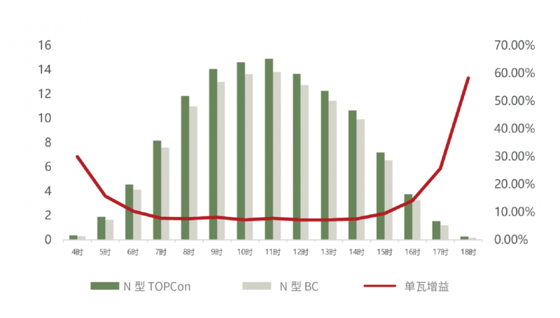 2025年6月2日至30日期間,對兩類組件性能進行了全面測試。測試數據顯示,TOPCon組件29天單瓦發電量達119.61 kWh/kW,而N型BC組件為110.47 kWh/kW。TOPCon組件平均每瓦長期發電增益達8.27%。深入分析日變化規律發現: 在日輻照度較低的時候(輻照度小于400W/㎡),TOPCon組件的發電優勢尤為突出,單瓦增益高達10.79%,充分印證了其在極端弱光條件下的卓越性能。